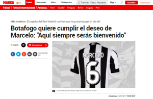 Em entrevista ao programa Globo Esporte, da Rede Globo, o lateral-esquerdo Marcelo revelou o seu desejo de vestir a camisa do Botafogo. A declaração do jogador repercutiu na imprensa internacional. Veja abaixo: