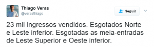 Na próxima terça-feira, às 21h45, Botafogo e Barcelona de Guayaquil se enfrentam pela quarta rodada do Grupo 1 da Copa Libertadores. Em seu perfil no Twitter, o jornalista Thiago Veras, da Rádio Tupi, revelou a nova parcial de ingressos vendidos para o confronto. Veja abaixo: