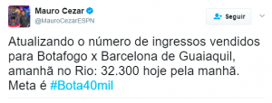 Amanhã, às 21h45, no Nilton Santos, Botafogo e Barcelona de Guayaquil se enfrentam pela quarta rodada do Grupo 1 da Copa Libertadores. O jornalista Mauro Cezar Pereira, da Espn Brasil, acaba de divulgar uma nova parcial da venda de ingressos para a partida. Veja abaixo: