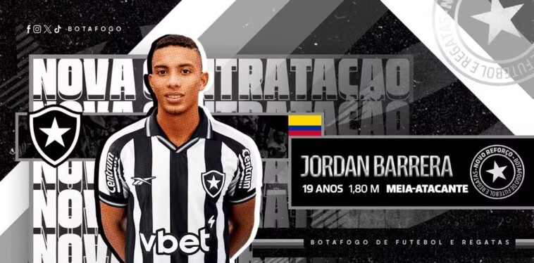 O Botafogo anunciou oficialmente a aquisição do meio-campista Jordan Barrera, de 19 anos, que estava no Junior Barranquilla. O clube alvinegro desembolsou US$ 4 milhões para adquirir 90% dos direitos econômicos do atleta colombiano.