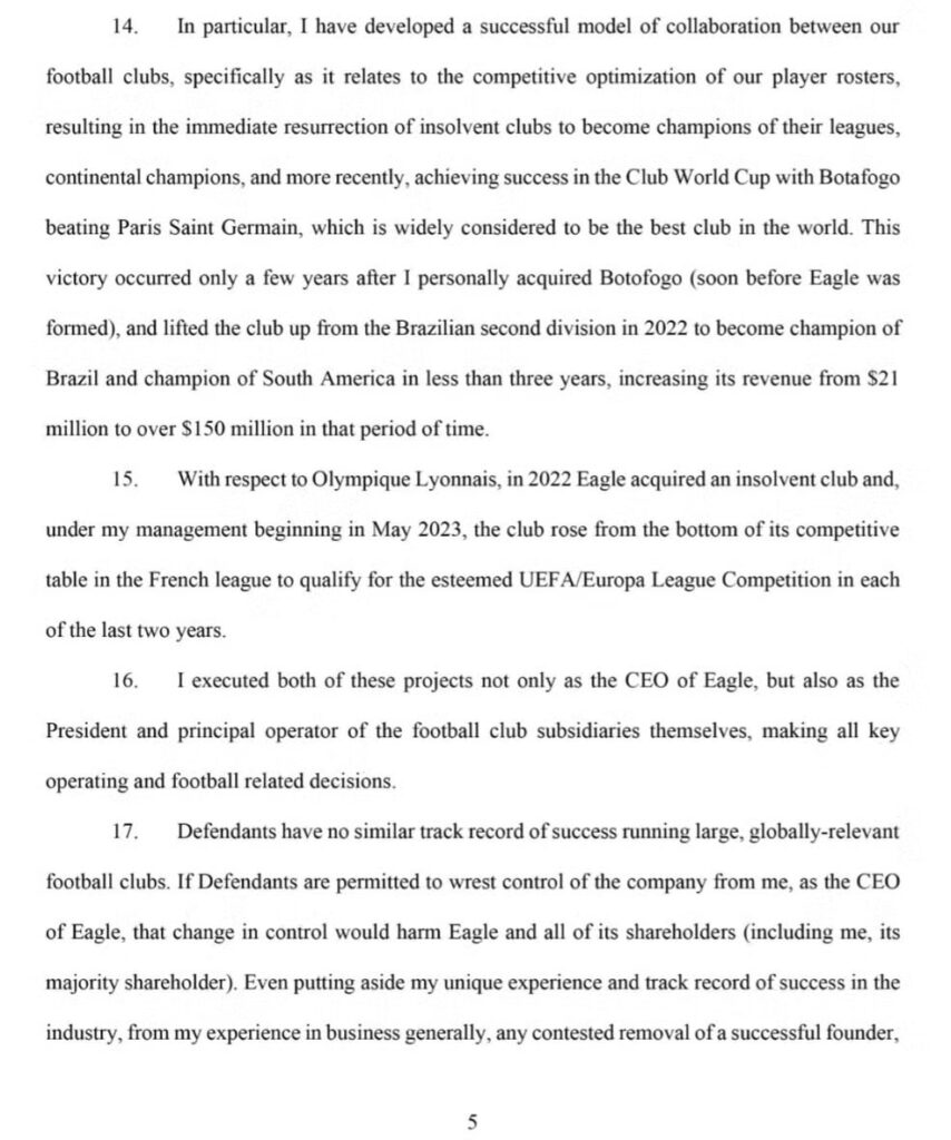 - Experiência e Competência: “Os réus não têm sucesso similar comandando clubes de escala mundial. Se os réus assumirem o controle da Eagle de mim, essa mudança no comando faria mal à Eagle e a todos seus acionistas.”