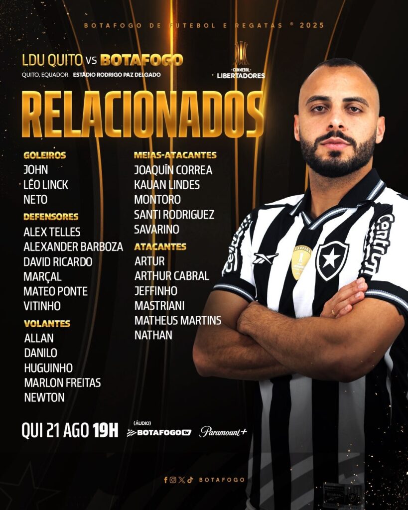 O Botafogo divulgou a lista de jogadores relacionados para a partida decisiva contra a LDU, em Quito, pela Libertadores, e a torcida tem motivos para comemorar. O técnico Davide Ancelotti vai poder contar com os retornos de Arthur Cabral, David Ricardo e Newton, que estavam ausentes na derrota para o Palmeiras no último fim de semana.