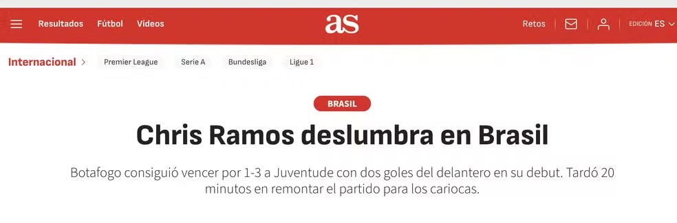 A estreia avassaladora do atacante espanhol Chris Ramos no Botafogo não passou despercebida na mídia de seu país de origem. Ao marcar dois gols em apenas 10 minutos na vitória de 3 a 1 sobre o Juventude, o jogador de 28 anos, conhecido por sua passagem pelo Cádiz, virou manchete em veículos como AS e Marca, que se impressionaram com seu impacto imediato.